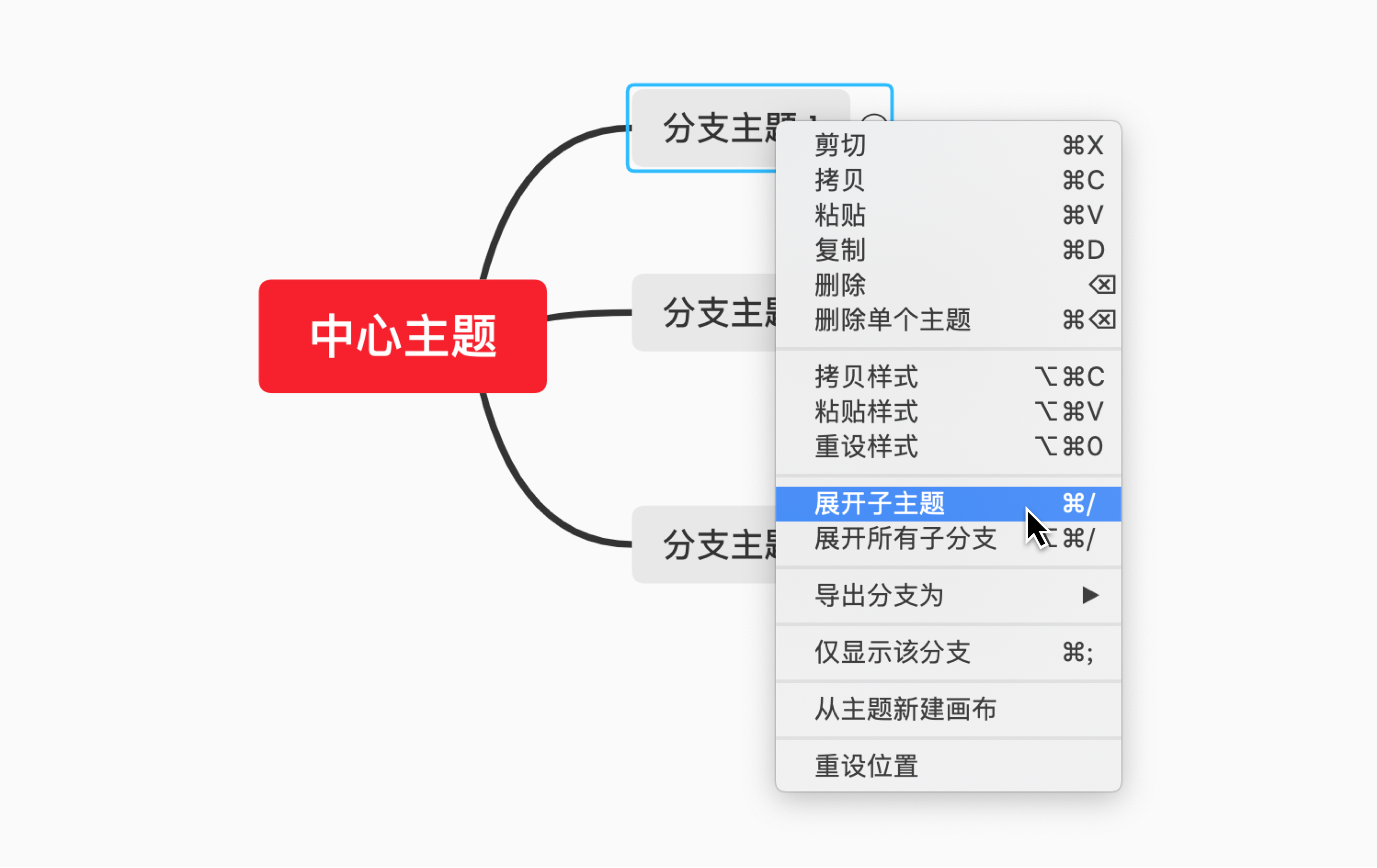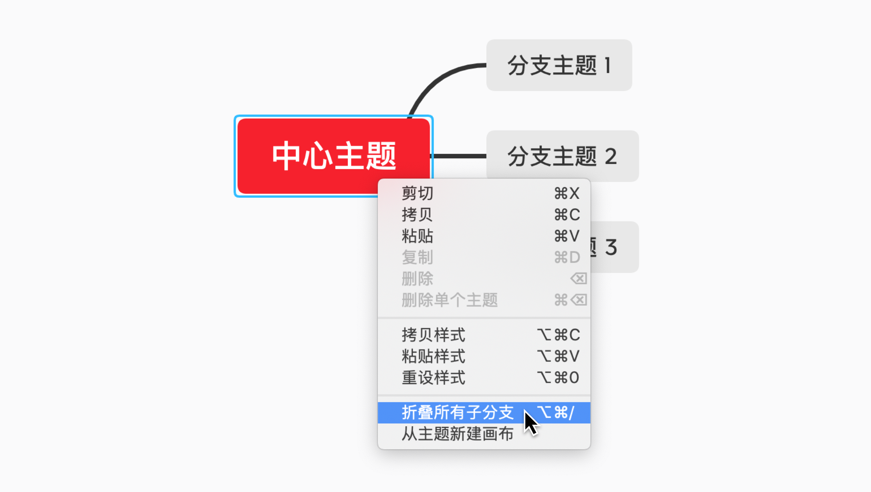 (1)选中中心主题,右键唤出折叠所有子分支;