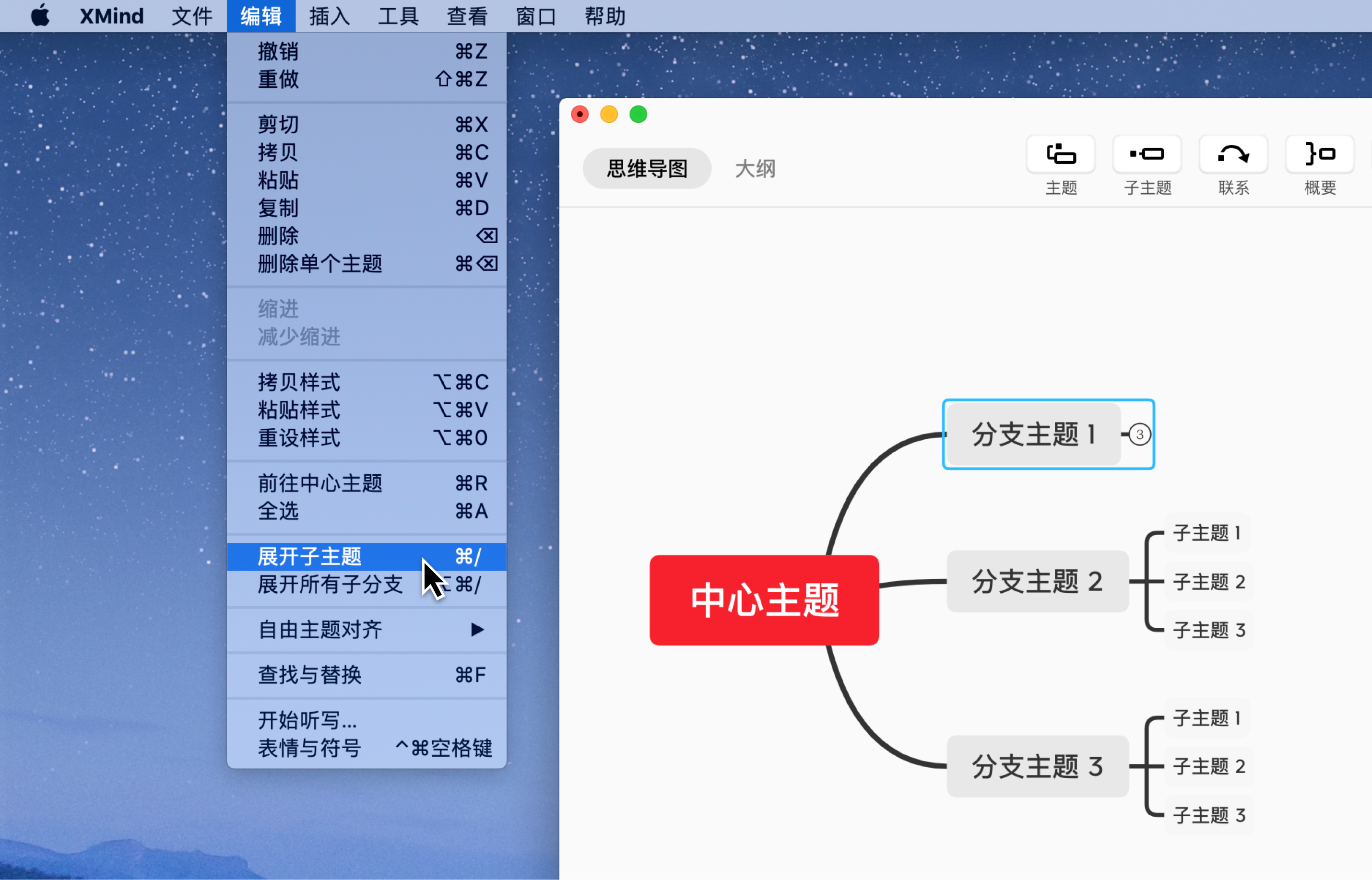 (2)选中中心主题,在菜单栏中的编辑中选择展开所有子分支。