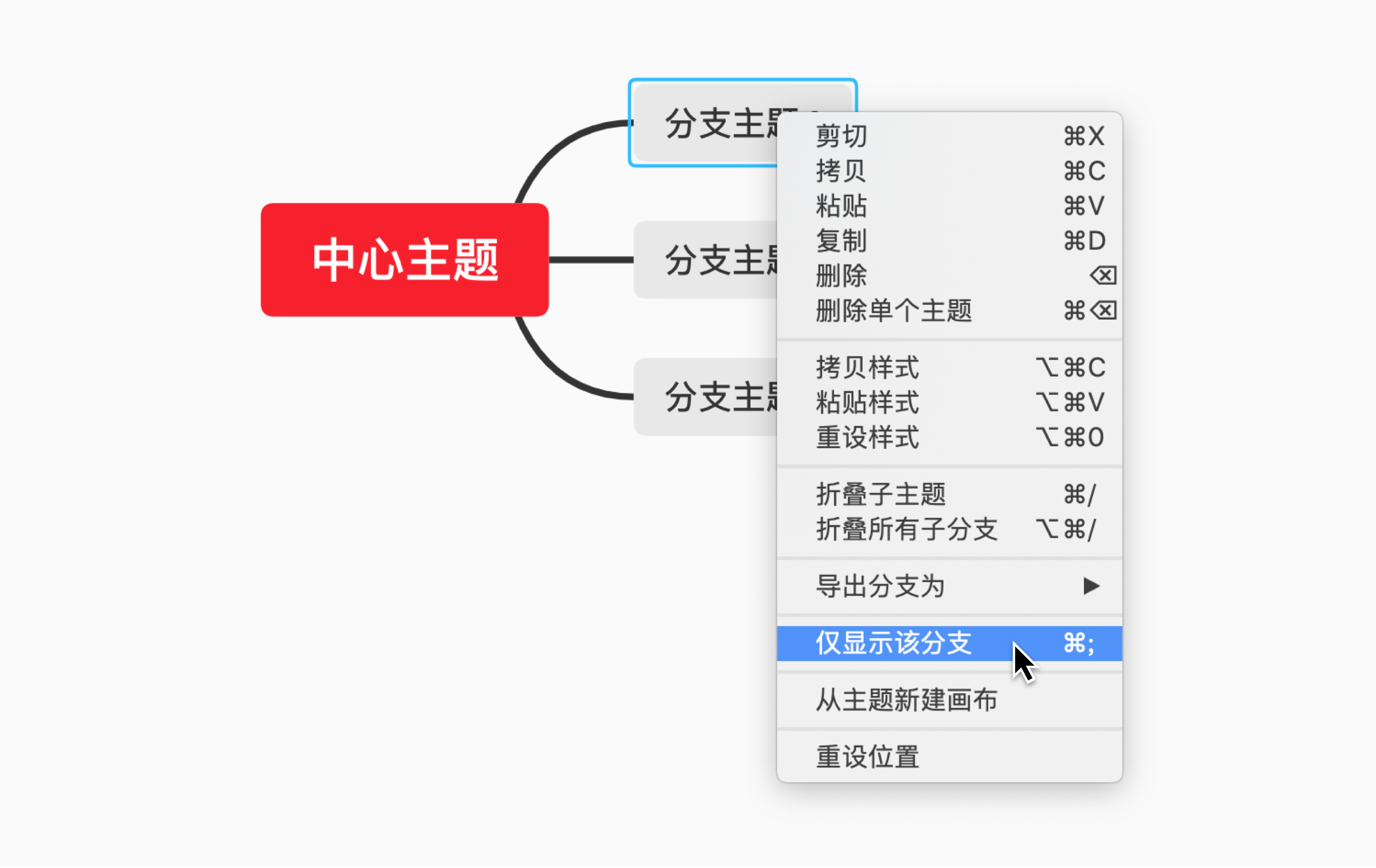 在绘制内容较多的Xmind思维导图时,可以仅显示当前的分支内容,集中火力在当前内容的绘制。