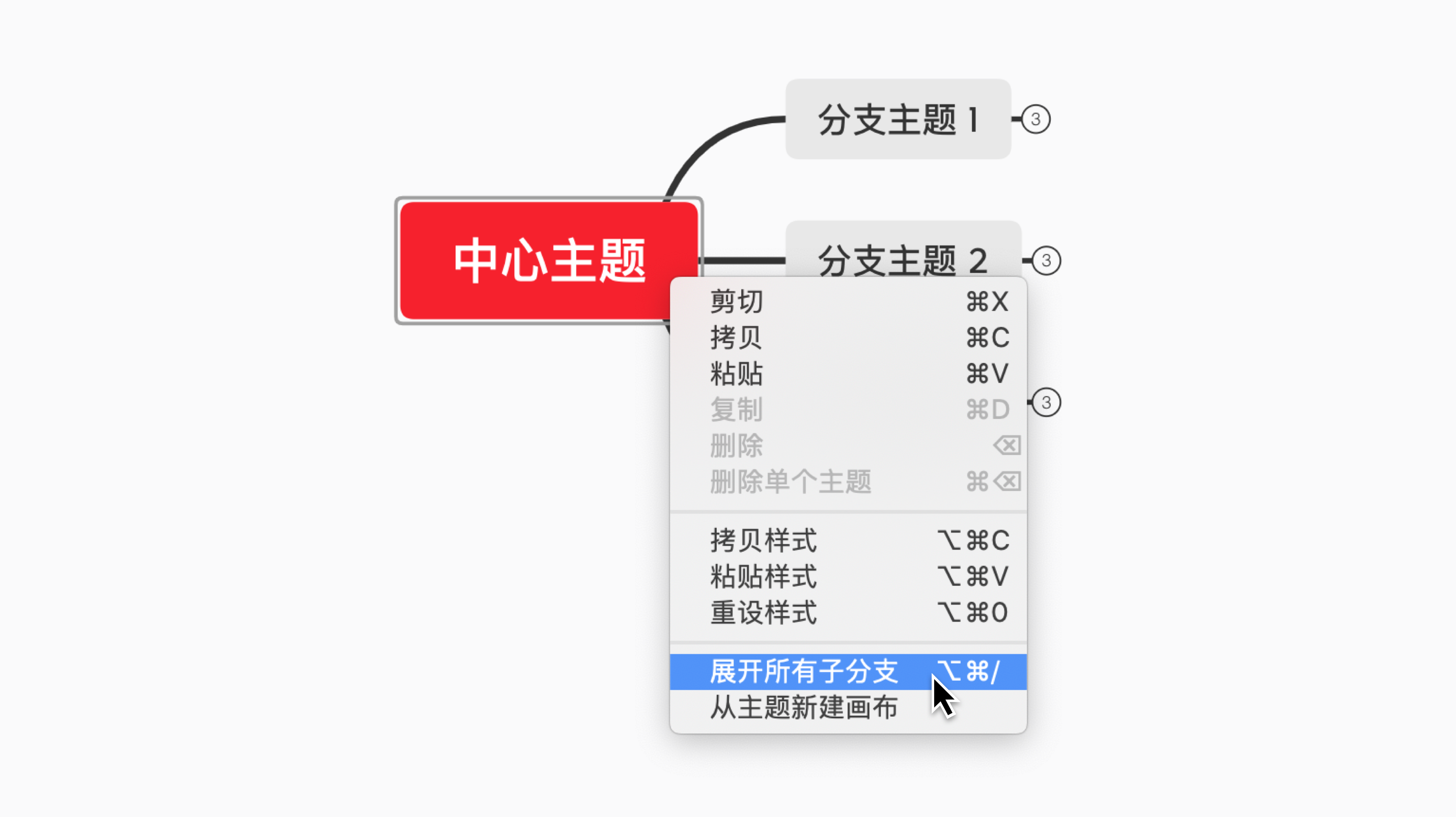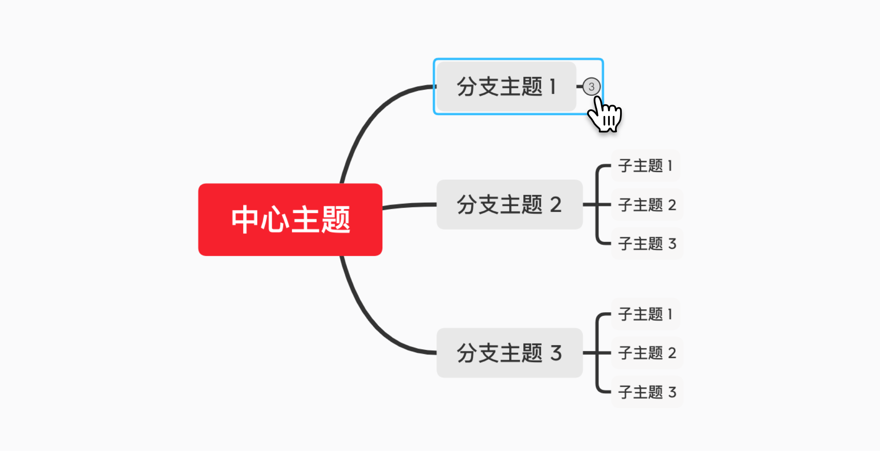 (1)已经被折叠的主题,主题节点处会显示被折叠的子主题数量,直接点击即可展开被折叠的子主题;