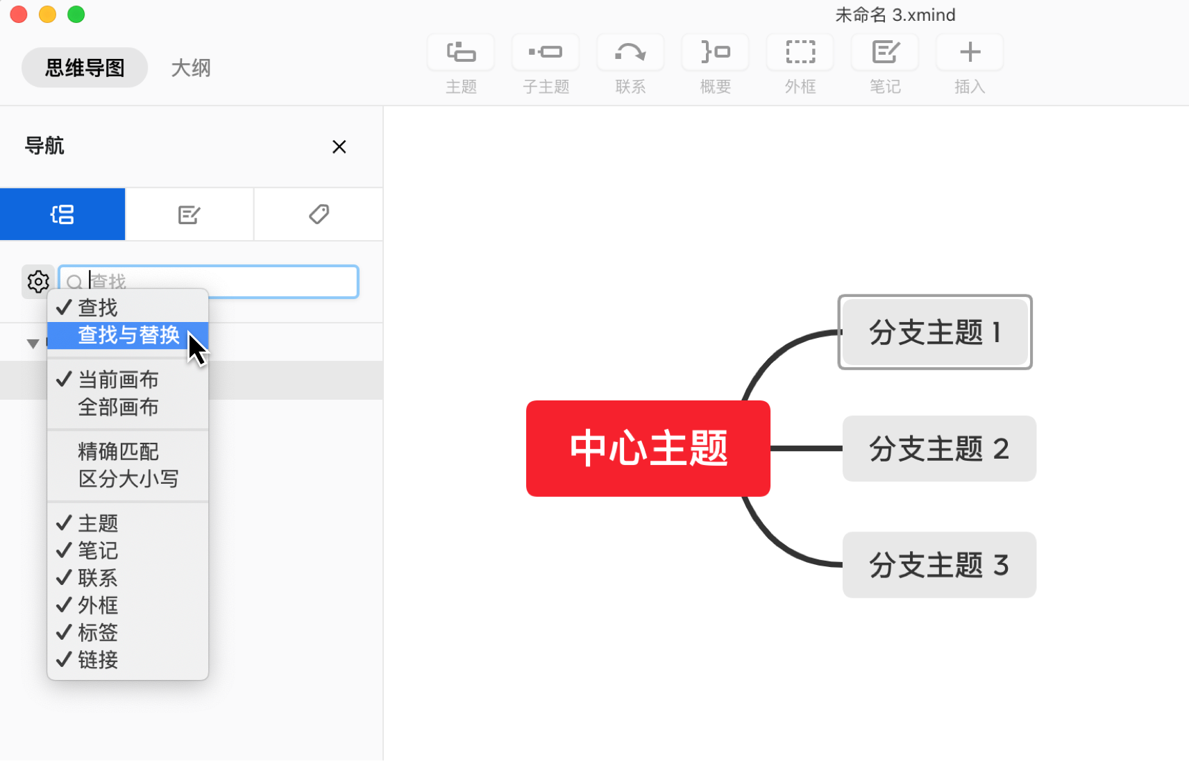 如果导图内容特别繁多,可以用导航面板来快速搜索定位想找的关键内容,也可以快速替换导图文字。