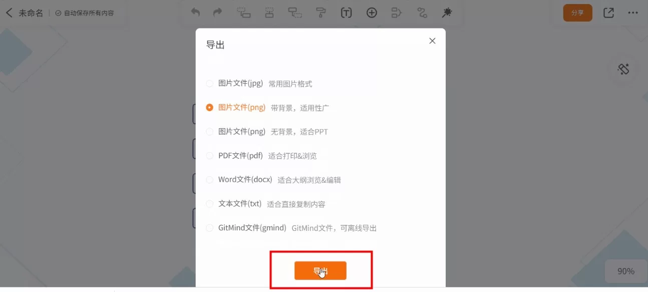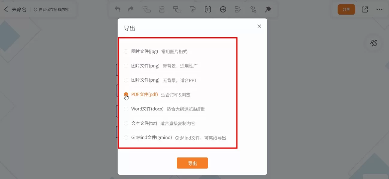 2、在弹窗内选择导出格式,GitMind文件导出支持JPG、PNG、PDF、DOCX、TXT等文件格式;