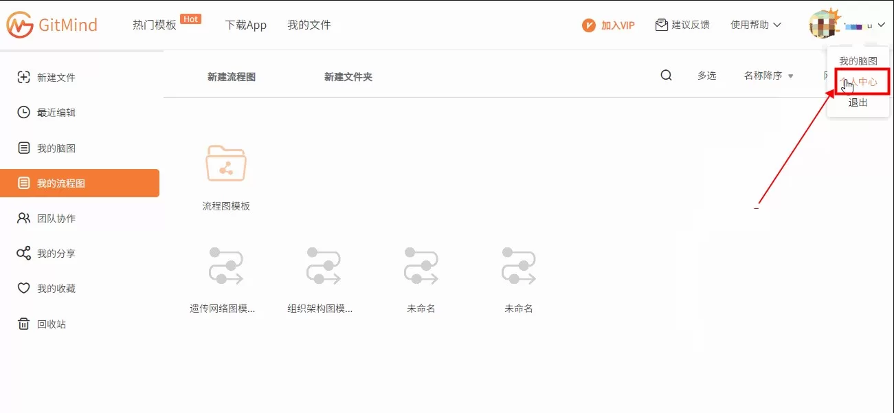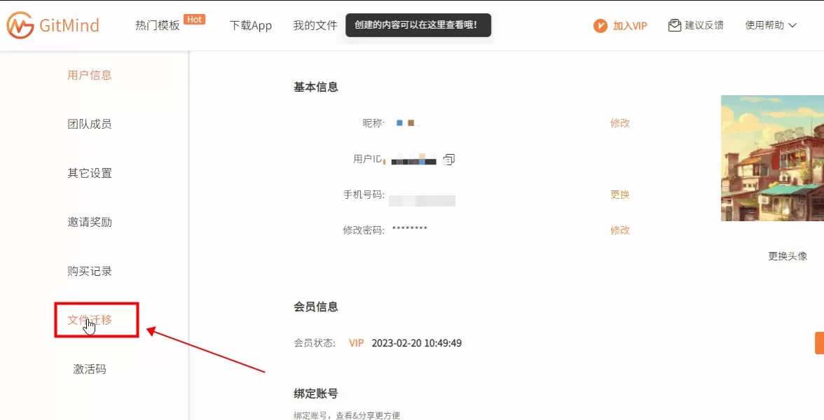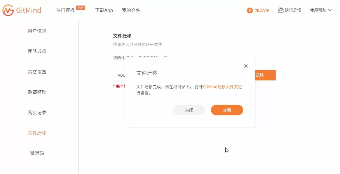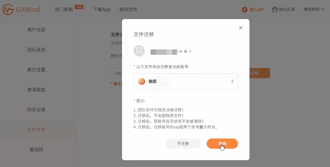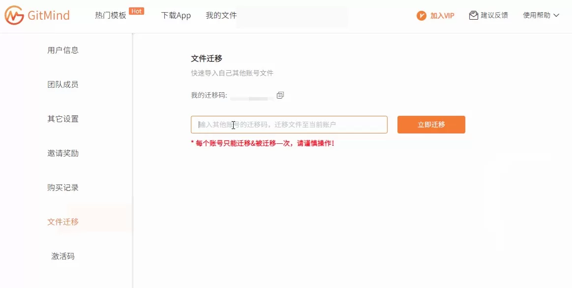 1、GitMind支持将其他账号的思维导图文件迁移至新账号,只需要进入个人中心,点击【 文件迁移】;