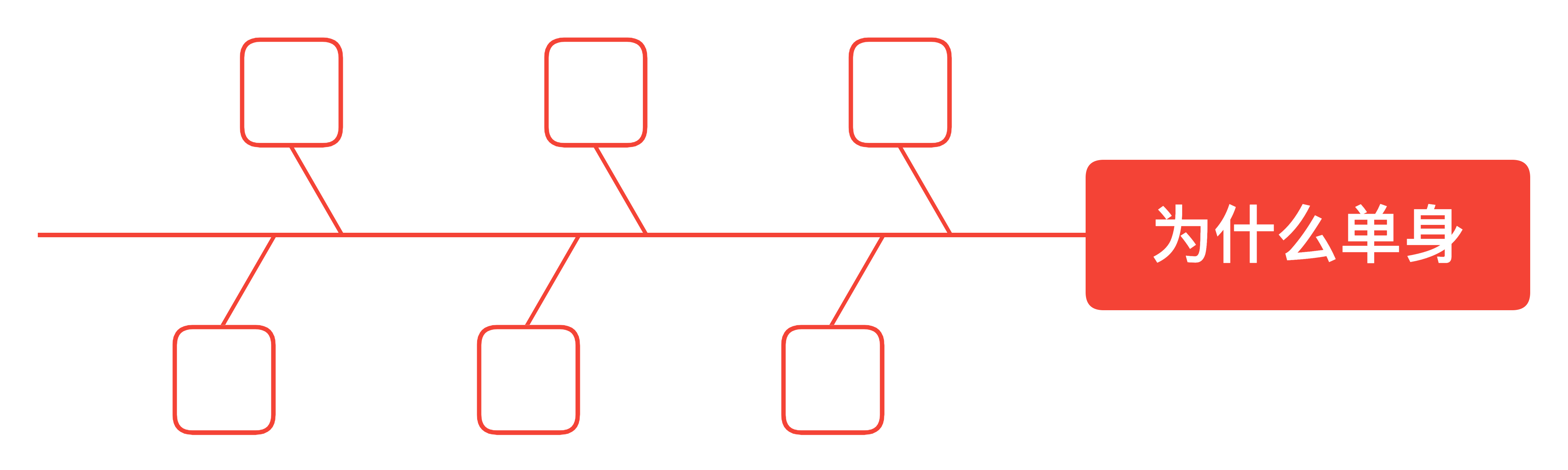 1、确定思考的问题。明确我们所面临的问题“为什么单身”后,第一步即是打开 XMind 中的鱼骨图结构,把问题写在鱼头。