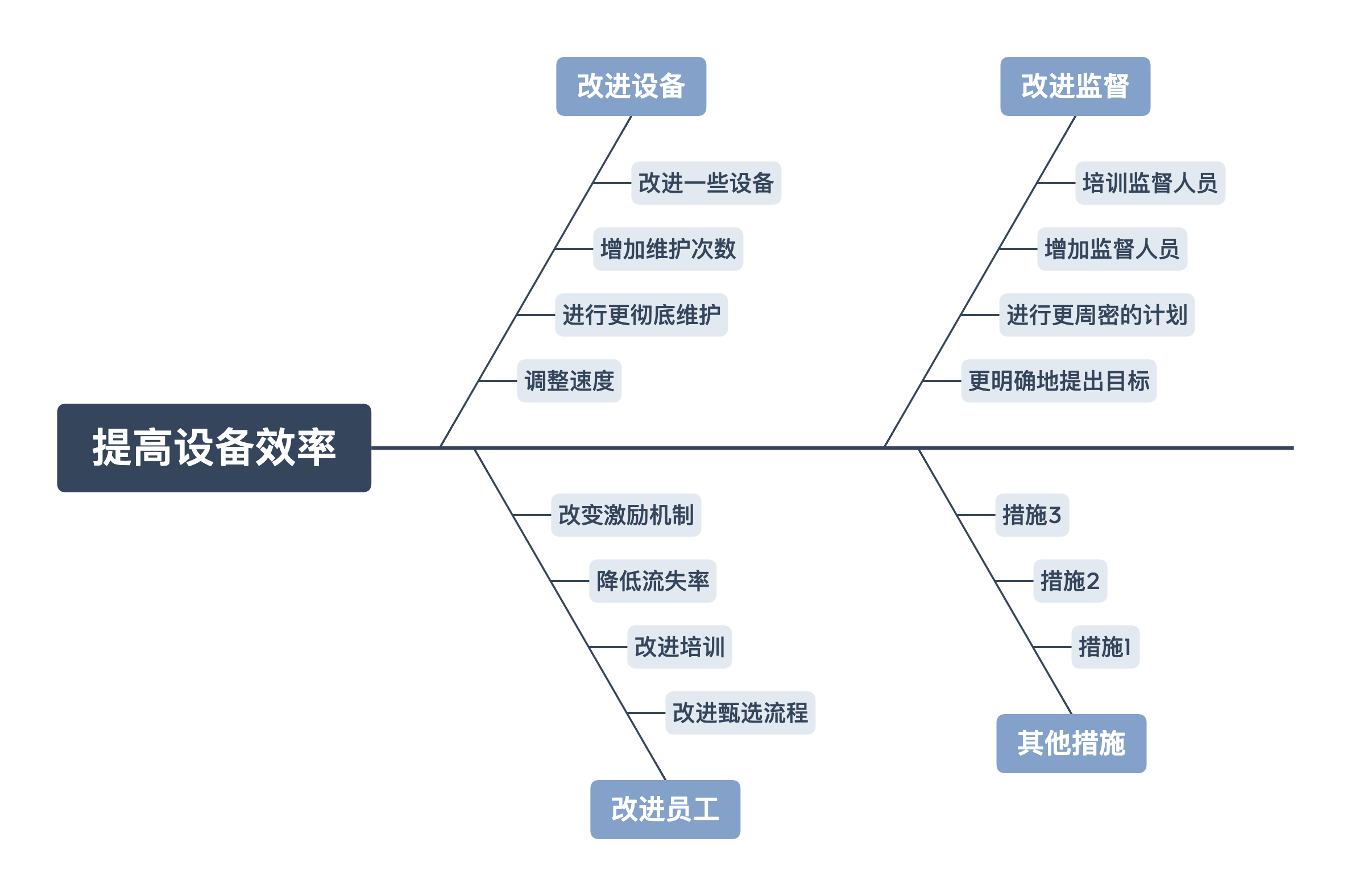 有问题即有对策。面临难题时,找出原因很重要,根据原因找到相应的对策也很重要。在进行对策分析时,用鱼骨分析法也是一个很好的思路。比如下图针对提高设备效率的应对措施鱼骨图。