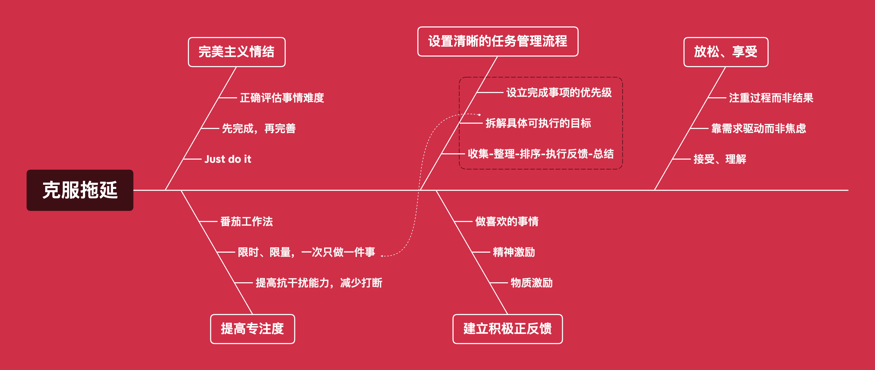还有以下面对拖延顽疾时相应的对策分析图。当你对现状产生不满,对自身所处的境遇不满时,不妨找个安静的时刻,认真审视和反思下自己想改变的地方,找出原因,想好对策。