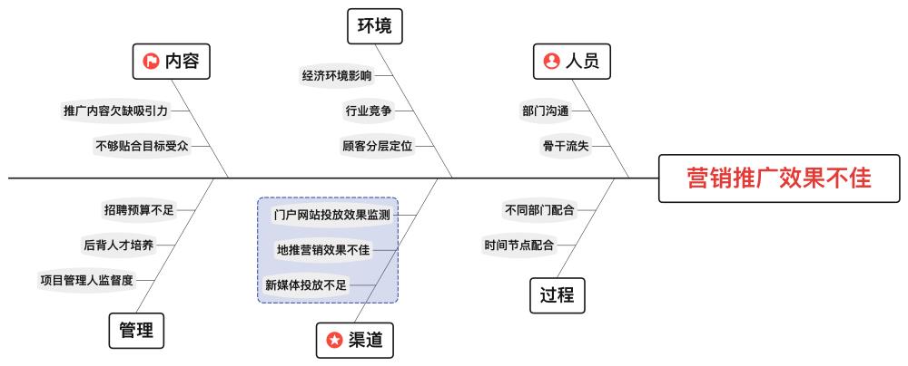 常用的鱼骨图有原因型鱼骨图(鱼头在右)和对策型鱼骨图(鱼头在左)两种,用来分析问题和解决问题。下图即是一张分析营销推广效果不佳原因的鱼骨分析图,分别从人员、过程、环境、渠道、内容、管理六大方面来分析本次推广效果不佳的原因。