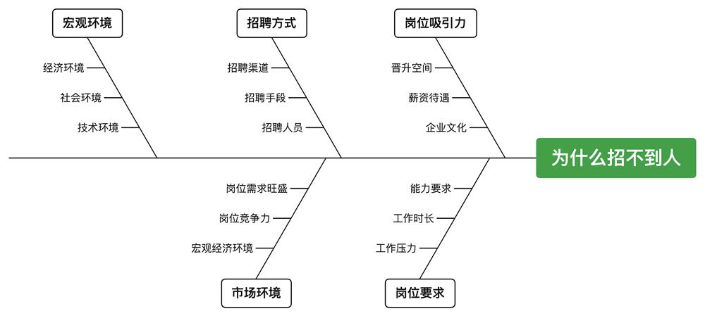 鱼骨分析法可以建立思考问题的框架,尽可能全面地去分析问题可能产生的原因,再根据现实情况一一验证,找出问题的根本原因后制定相应的应对措施和改进方法。比如企业在遇到招聘难题时可以用鱼骨分析法来分析自身存在的问题。