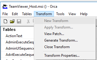 1、安装Orca后,打开它并打开TeamViewer (Classic)_Host.msi,单击【Transform→New Transform】: