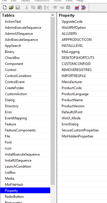 - 可以在此处找到Microsoft Orca:https://docs.microsoft.com/en-us/windows/desktop/msi/orca-exe