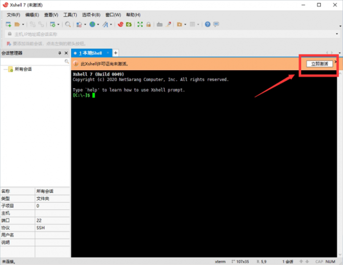 1、Xshell 7安装完成后,双击打开Xshell 7,会显示“许可证尚未激活”,点击下图中的“立即激活”按钮。