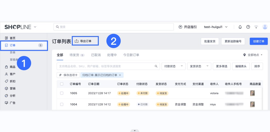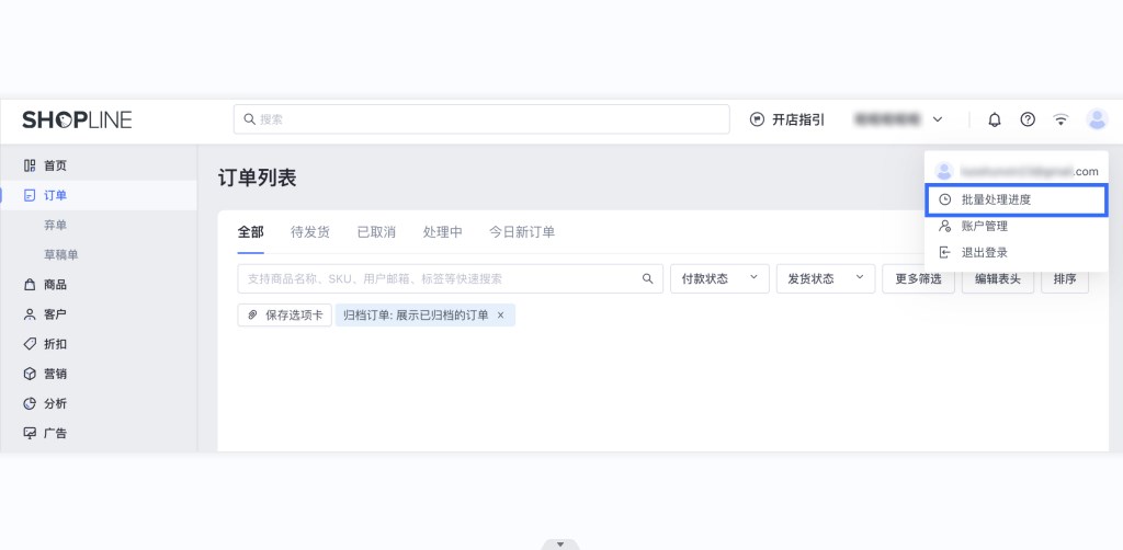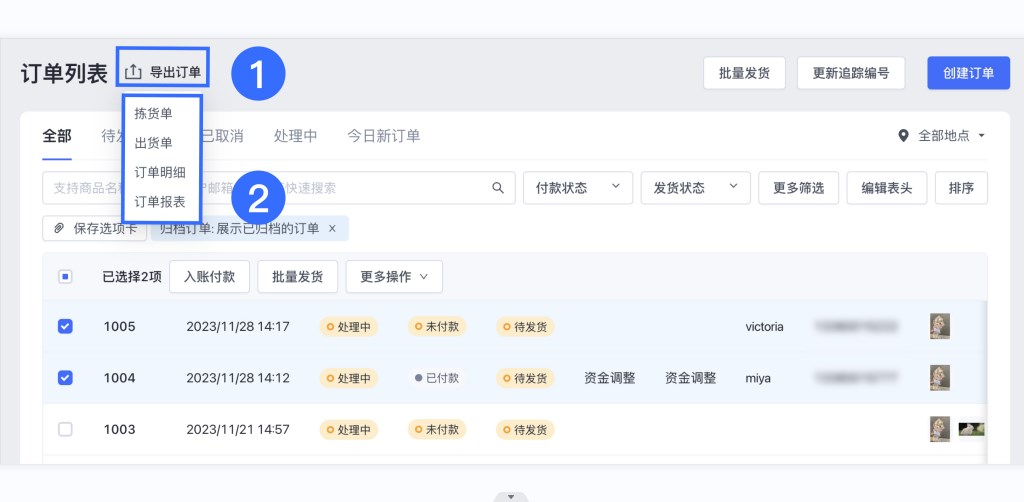 - 批量导出时若需要导出已归档订单,请先筛选出归档后再导出(已归档订单默认在订单列表隐藏);