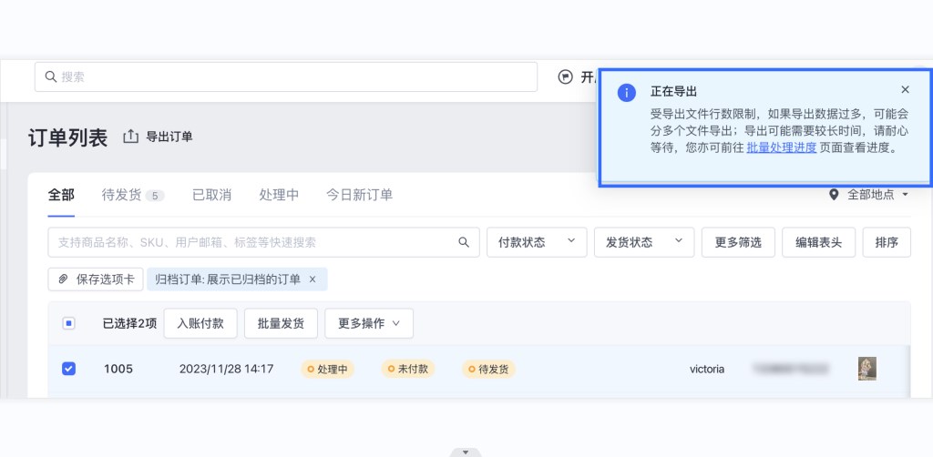 导出大批量订单所需时间较长,可以在【批量处理进度】页面查看相关订单的导出进度