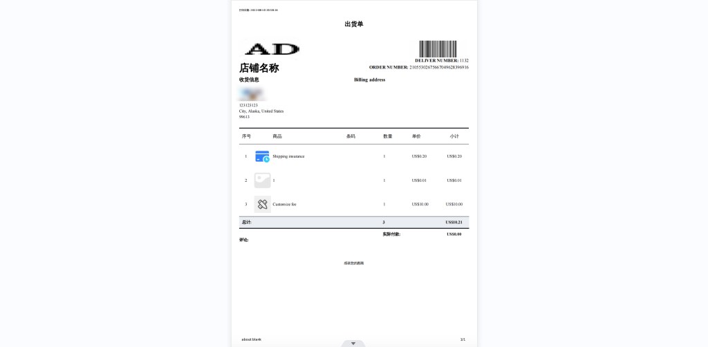 出货单仅提供出货的必要资讯。出货单的页面简洁,且会隐藏订购人相关资讯,仅提供收件人的必要信息。