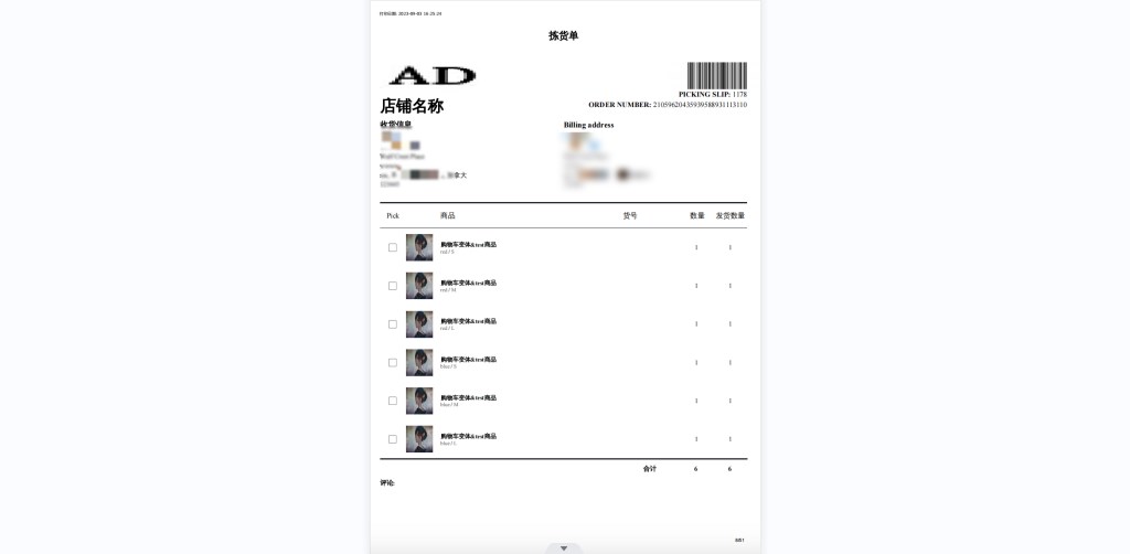 拣货单提供拣货的必要信息,包含收货地址、拣货地址、商品图片、商品信息、商品数量等。