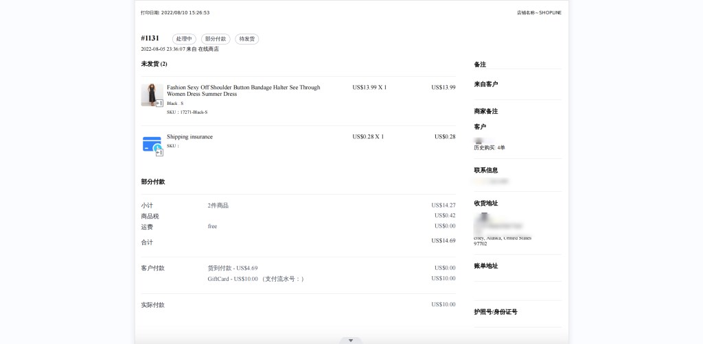 订单明细会提供较完整的订单信息,除了出货单包含的信息以外,还另外包含了店家 Logo 、订单状态、付款状态、顾客信息、商品图片、订单信息内容等等。如果订单套用了多项折扣活动,也会一一陈列出来。