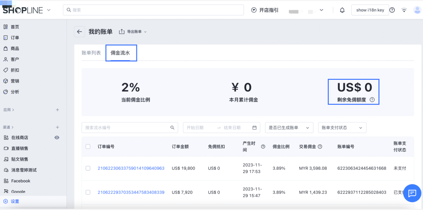可以在后台【设置】>【套餐】>【查看账单】佣金流水页面查看店铺的佣金流水和免佣额度。