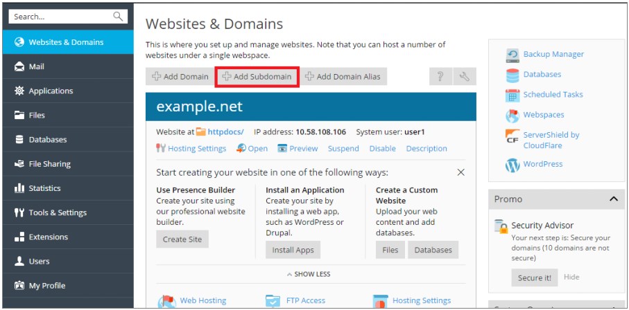 若要添加一个子域名,请转入 网站与域名 标签 > 添加子域名 。