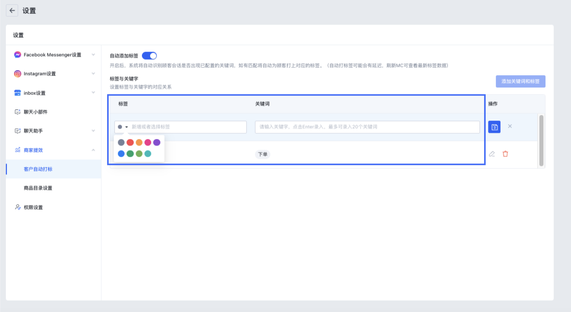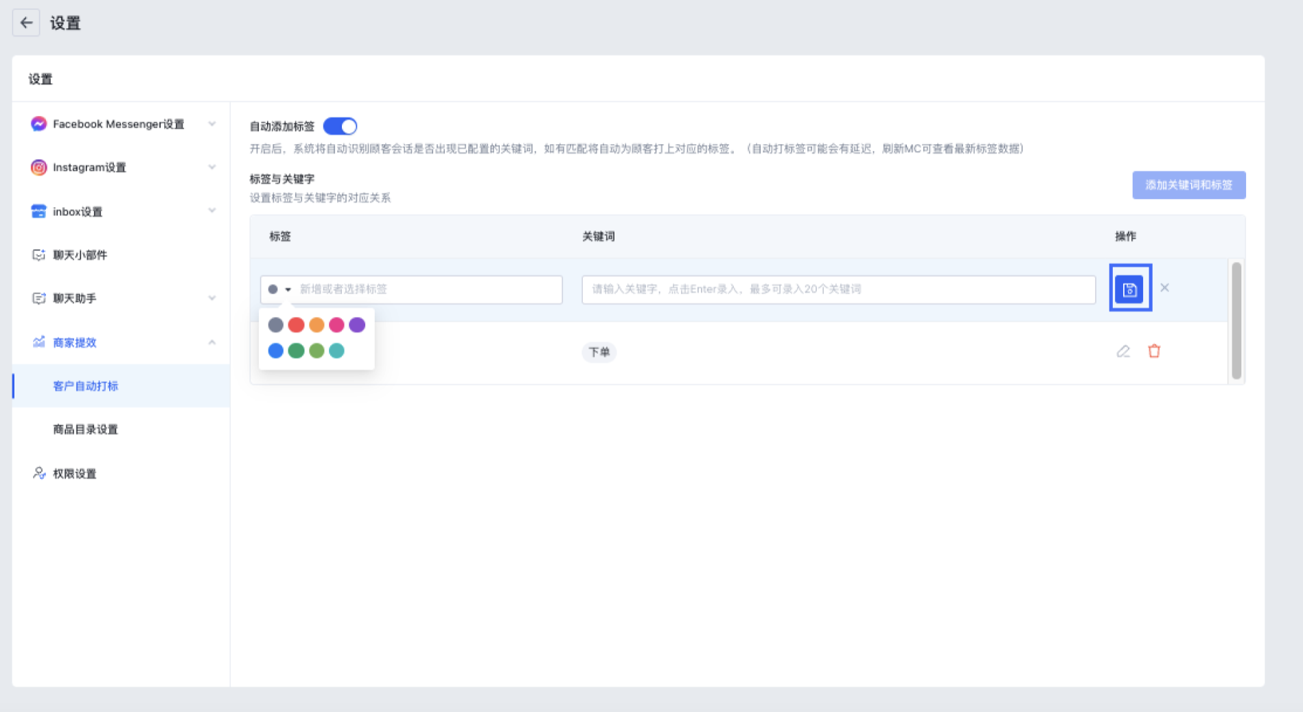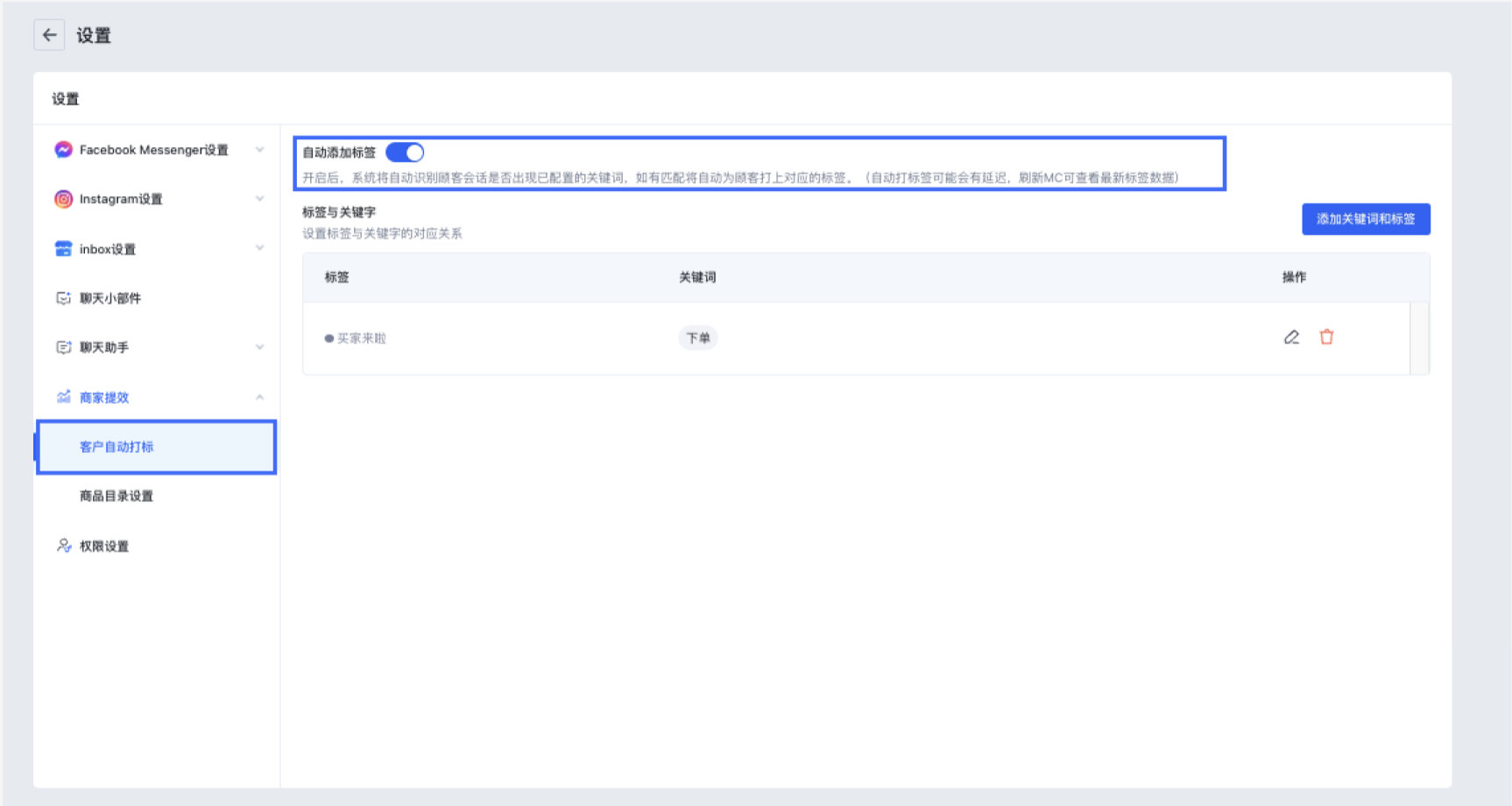 (3)进入客户自动打标设置页, 开启【自动添加标签】开关;