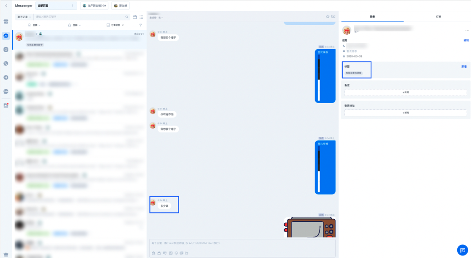 (2)在聊天室与顾客聊天的页面,当顾客的语言命中了配置的关键词,就会为顾客打上对应的标签。可以在与顾客的聊天框右侧的【资料】板块中进行查看。