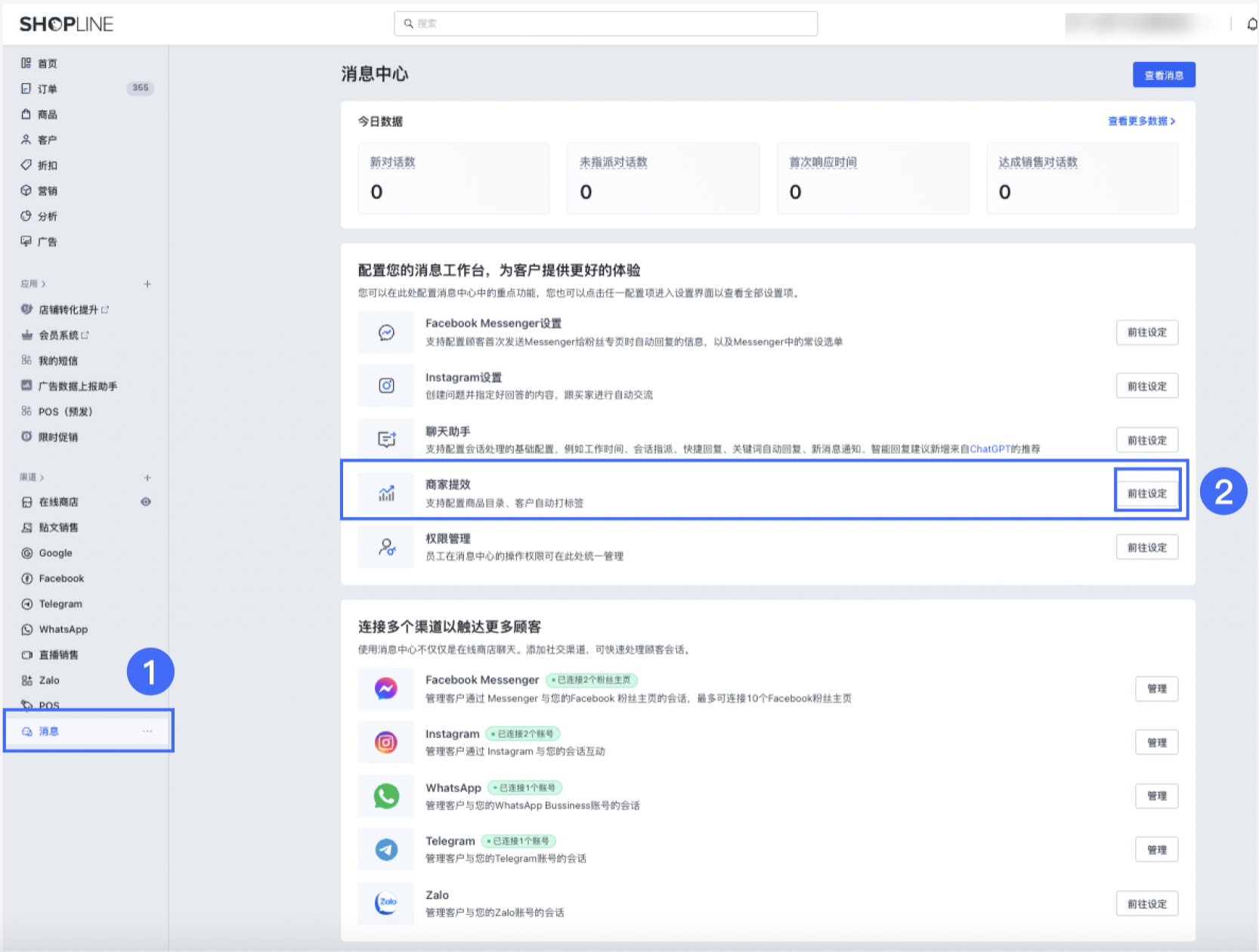 (1)在 SHOPLINE admin 中,点击左侧侧边栏的【消息】进入消息中心首页;