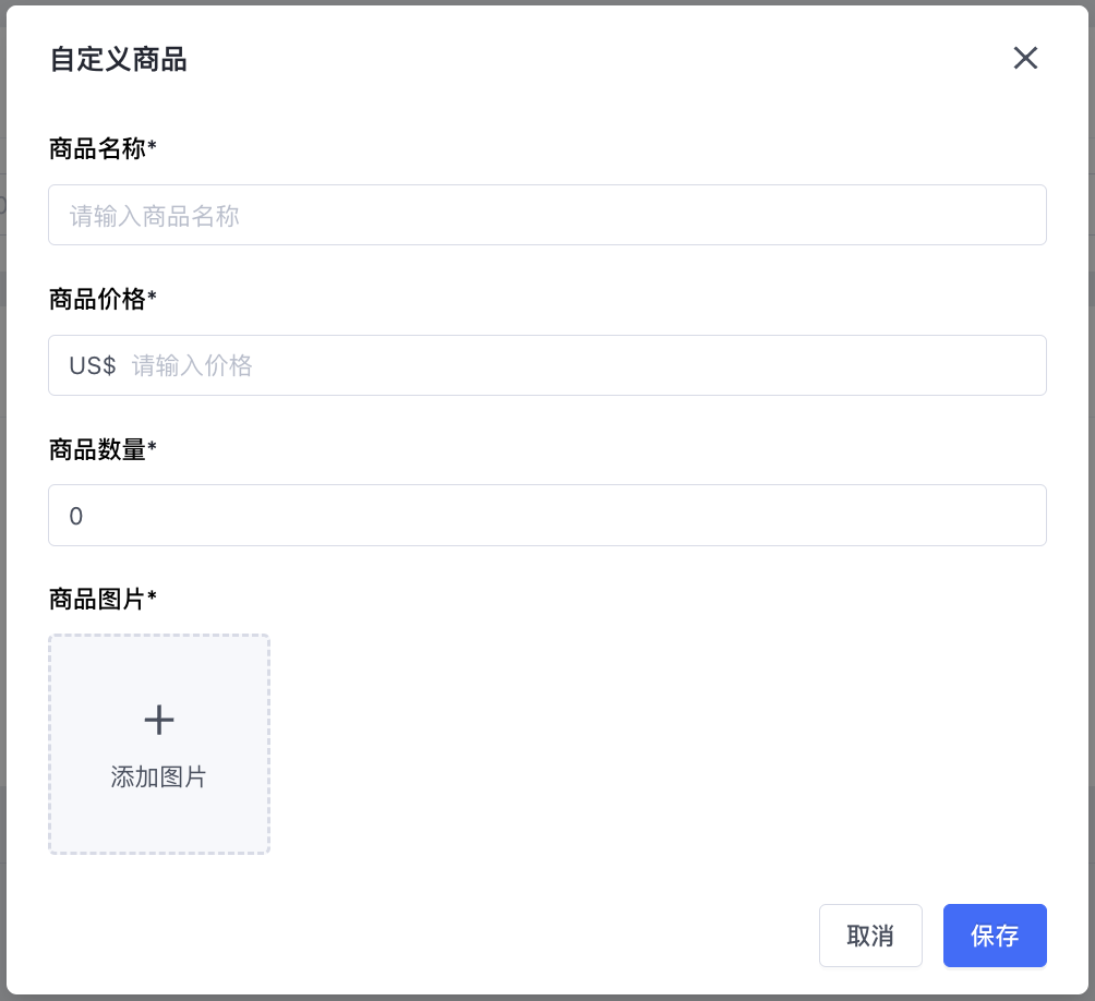 - 添加自定义商品:点击【添加自定义商品】出现添加自定义商品弹框,填写商品名称、商品价格、商品数量、商品图片,点击【保存】完成自定义商品添加;
