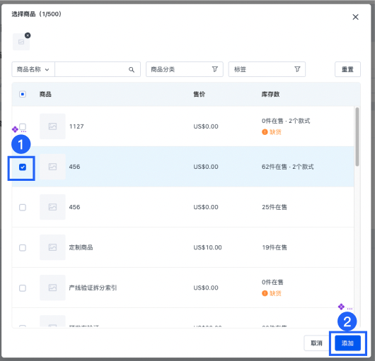 - 添加商品:点击【添加商品】出现添加商品弹框,选择商品后点击【添加】,所选择的商品将被加到商品目录中。