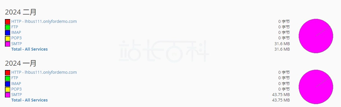 月饼图显示 cPanel 账户的各种服务和域每月使用的相对数据量。