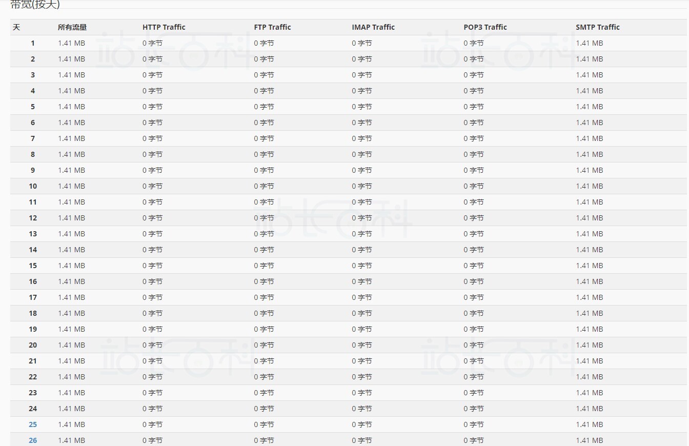 按天计算的带宽表以兆字节(MB)为单位列出了系统在当月某一天传输的 cPanel 账户数据总量。