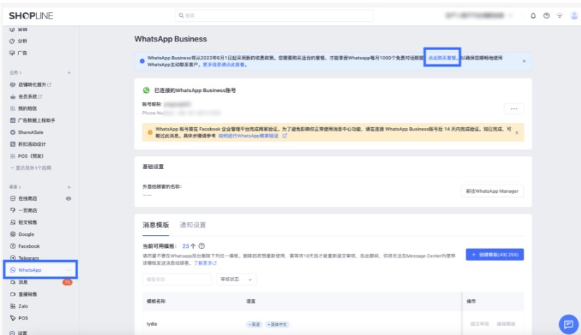在购买WhatsApp付费包之前,请确保在SHOPLINE后台添加了WhatsApp渠道并连接了WhatsApp账户。
