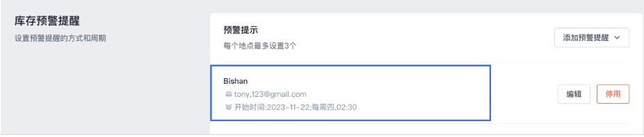 - 开始时间:库存预警提醒通知开始生效的时间,必填;
