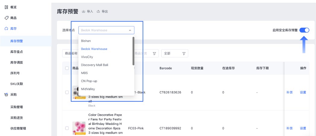使用库存预警通知,需要先对该地点开启安全库存预警。启用后,将显示该地点库存中所有可跟踪库存商品的列表。