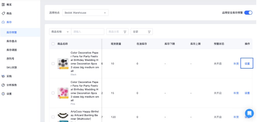 1、在【智能库存管理】>【库存】>【库存预警】界面,点击商品右侧【设置】。