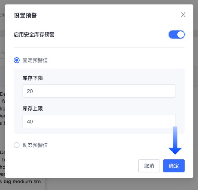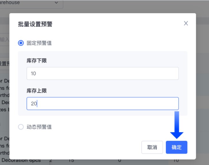 - 固定预警值:填写固定的库存预警数值;