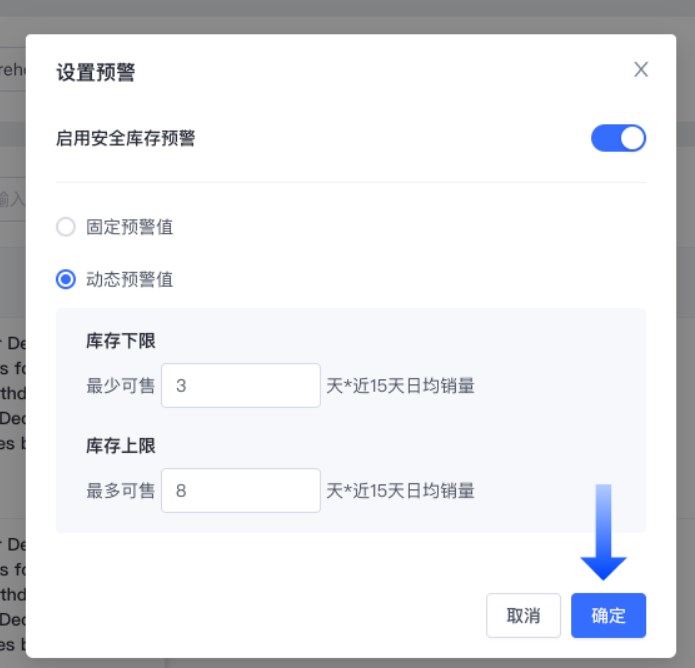 - 动态预警值:填写希望商品可售的最长/最短天数,我们将使用过去 15 天该商品的日均销量来计算动态预警值。这将为提供更灵活的库存管理指导。