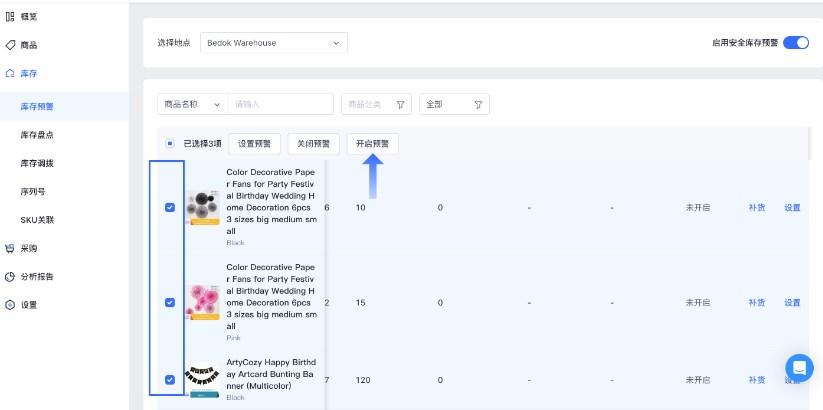 1、进入【智能库存管理】>【库存】>【库存预警】,选择需要开启库存预警的商品,点击【开启预警】,选定的商品库存预警被开启。