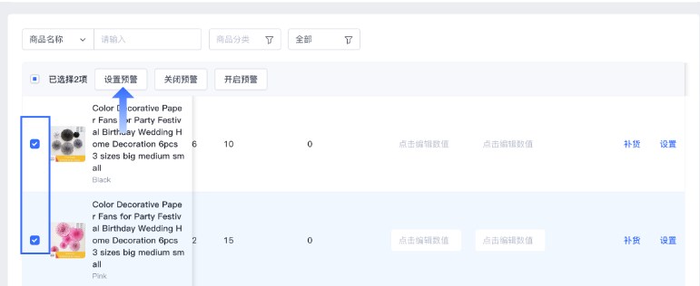 如果一次性设置库存预警的商品过多,可以选择批量操作。