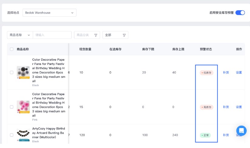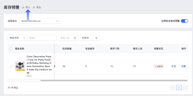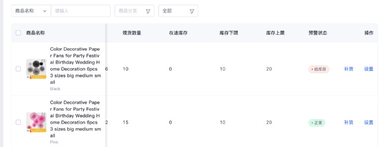 - 当前库存 ≤ 库存下限,该商品的预警状态显示为【低库存】;