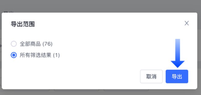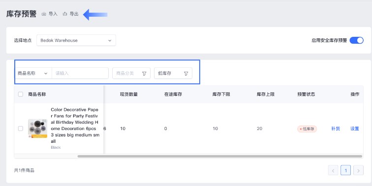 库存预警值不同的商品。使用商品名称、商品 SKU、商品分类、库存预警等条件,筛选目标商品,点击【导出】。可选择将全部商品导出或将所有筛选结果导出表格。表格填写库存预警上下限数值后,再点击【导入】,将商品导入,库存预警值设置完成。
