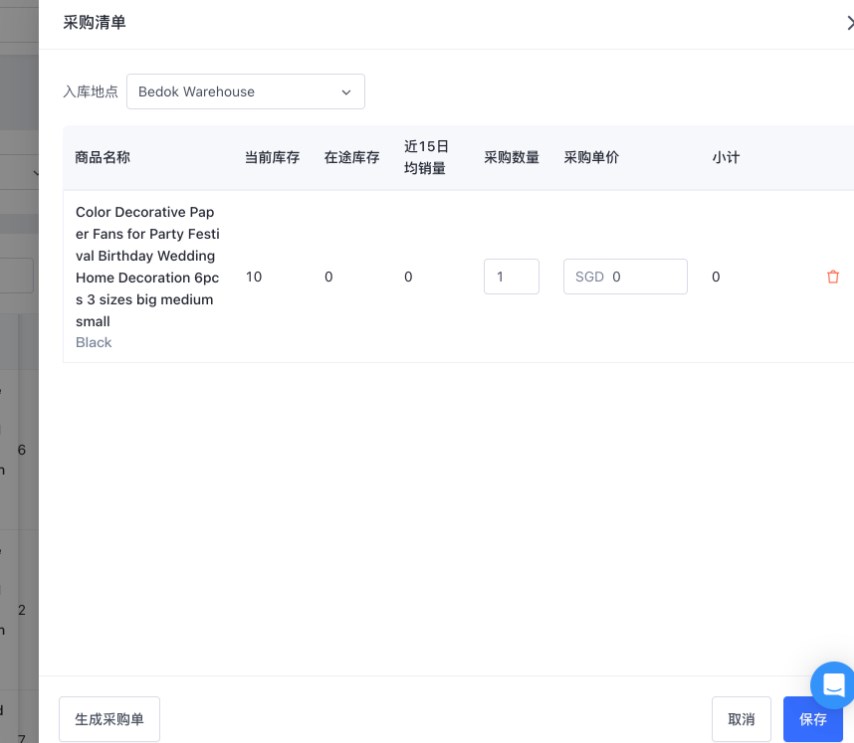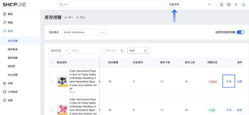 可以使用商品名称、SKU 搜索或根据预警状态(低库存)进行筛选,在需要采购补货的商品右侧点击操【补货】,将其添加到【采购清单】中,然后【保存】。