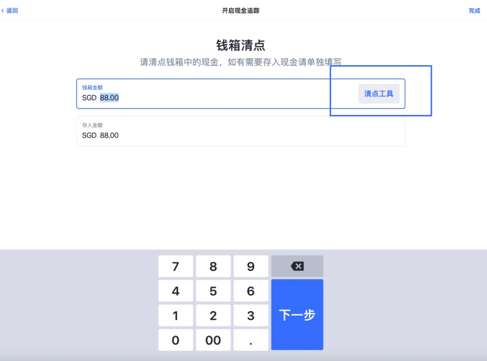 (2)如果开启了【现金追踪】,则需确认填写钱箱金额和存入金额,确认后点击【下一步】。也可以使用【清点工具】,按照钱箱中的货币币值逐个选择数量后点击【完成】,系统将自动计算总金额填入钱箱金额。
