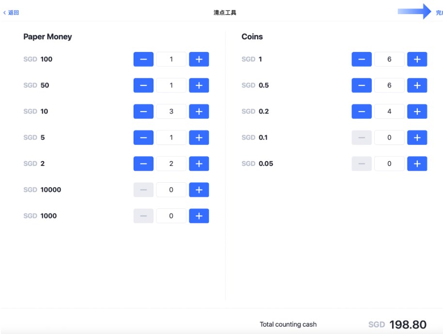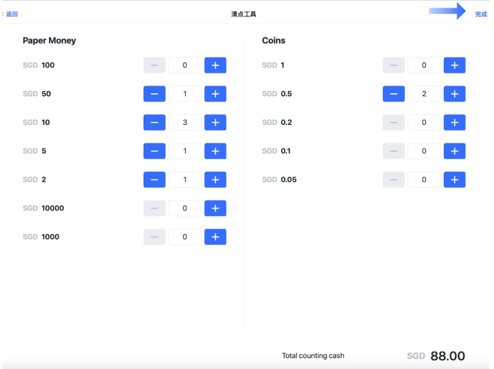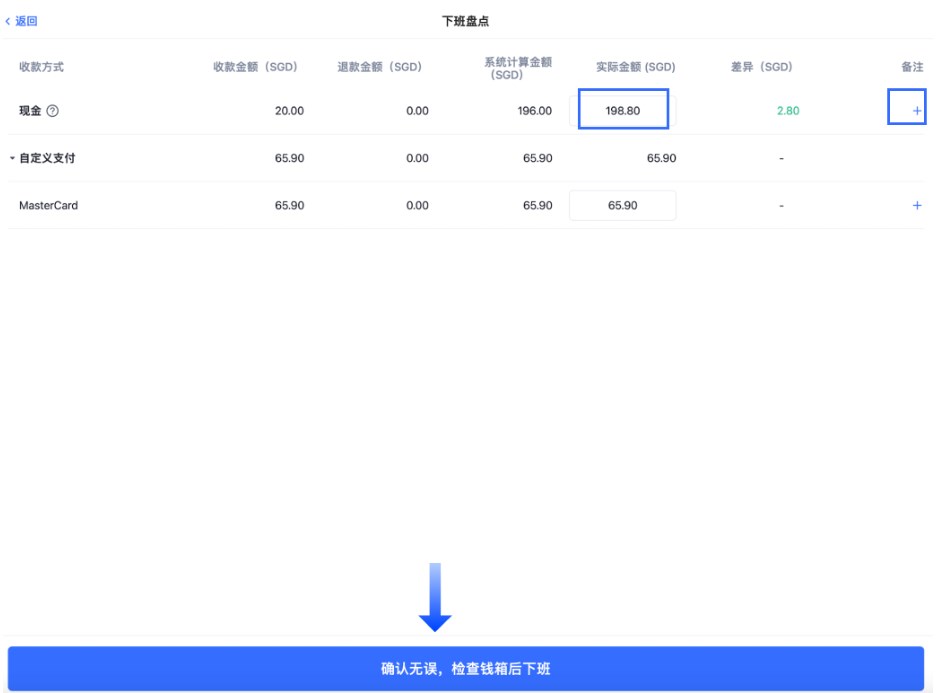 如果开启了【现金追踪】,可以根据实际的收款金额,点击【实际金额】,进入到【清点工具】界面,按照钱箱内实际情况选择货币币值,并点击【完成】。如有系统金额和实际金额有差额,请点击【+】,添加备注说明并点击【保存】。