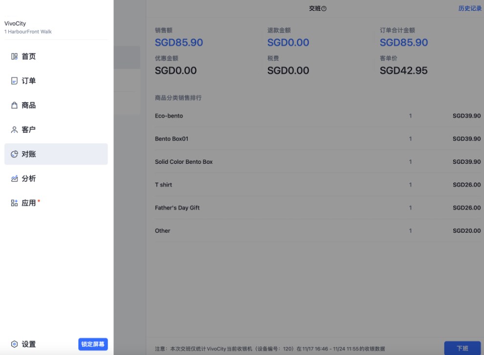 (1)在 POS APP 中,进入【对账】>【交班】,点击右下角【下班】。