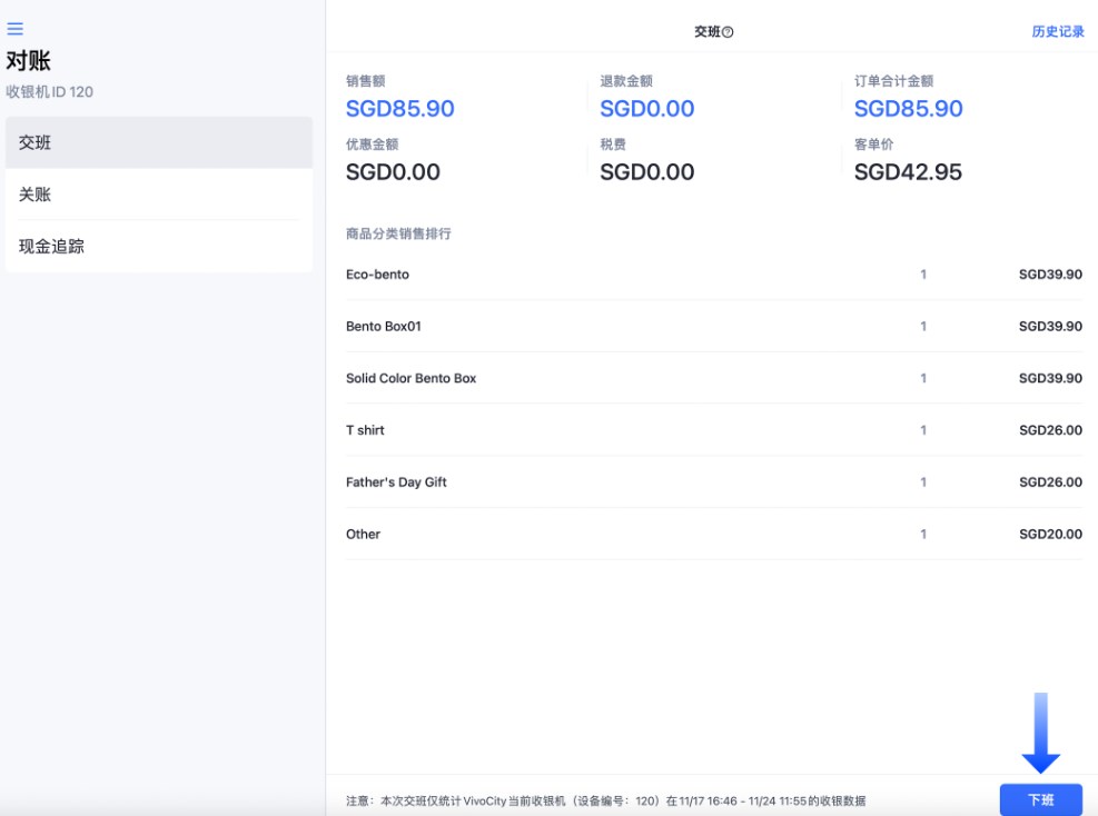 如果在 SHOPLINE admin 中设置了【下班后自动打印交班小票】,点击后将同步打印本班次的交班小票。