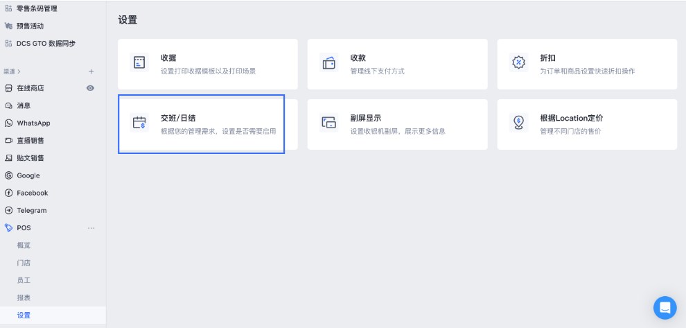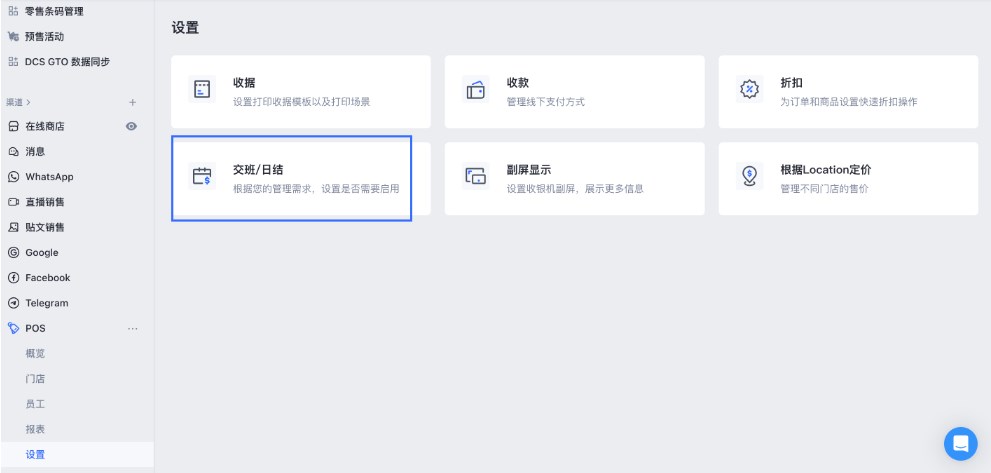 (1)在 SHOPLINE admin 中,进入【POS】>【设置】>【交班/日结】。