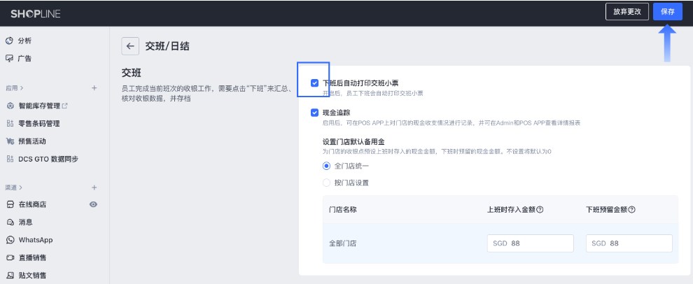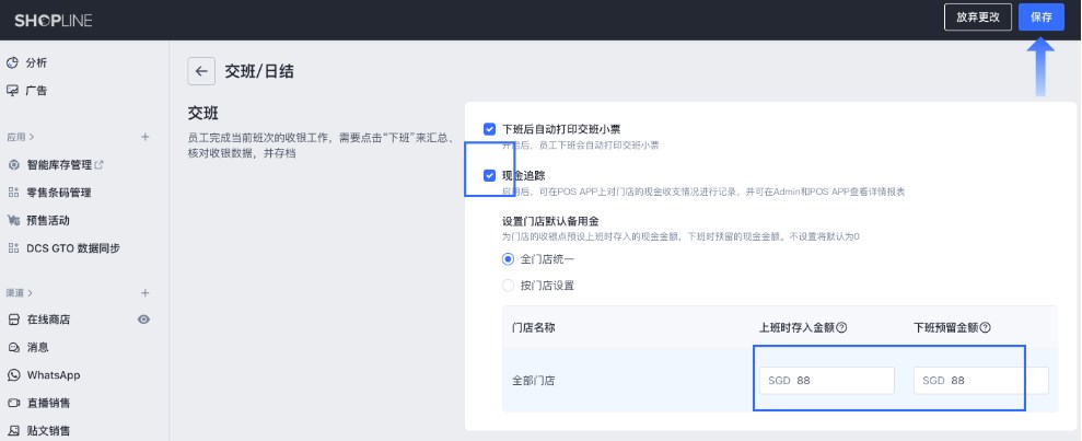 当需要在上下班时对钱箱中的金额和存入/取出钱箱的金额进行追踪和记录,可以在 SHOPLINE admin 中开启现金追踪。
