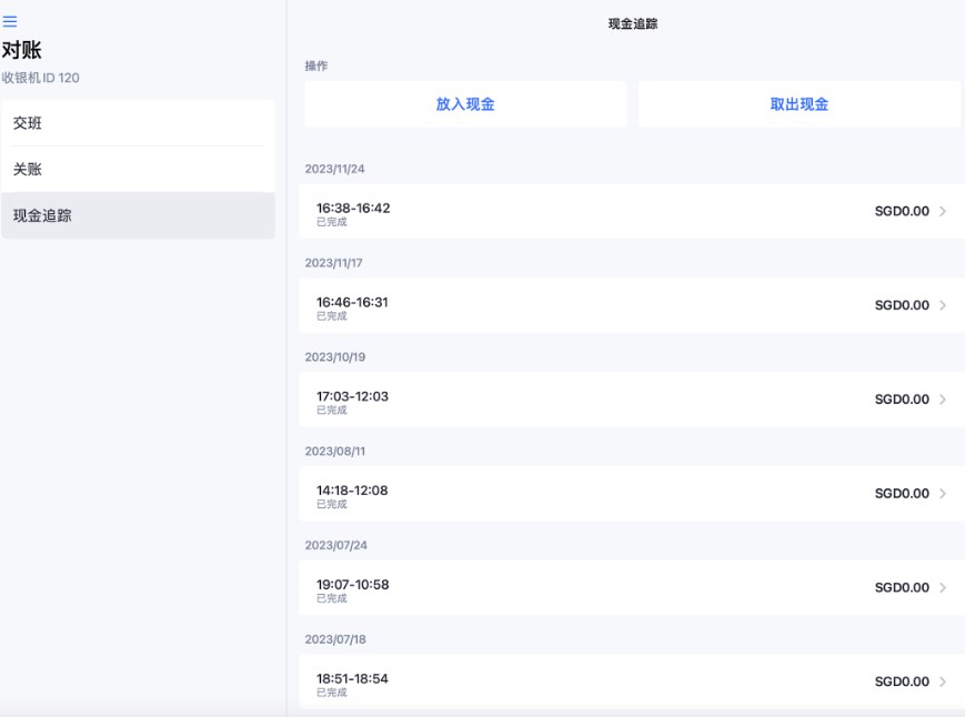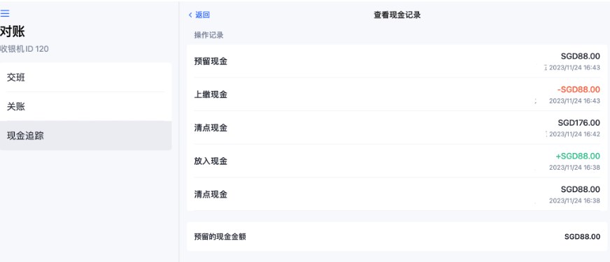 在 POS APP 中,进入【对账】>【现金追踪】,查看每一次交班的钱箱中现金的出入记录。点击单笔记录,可进入查看记录明细。