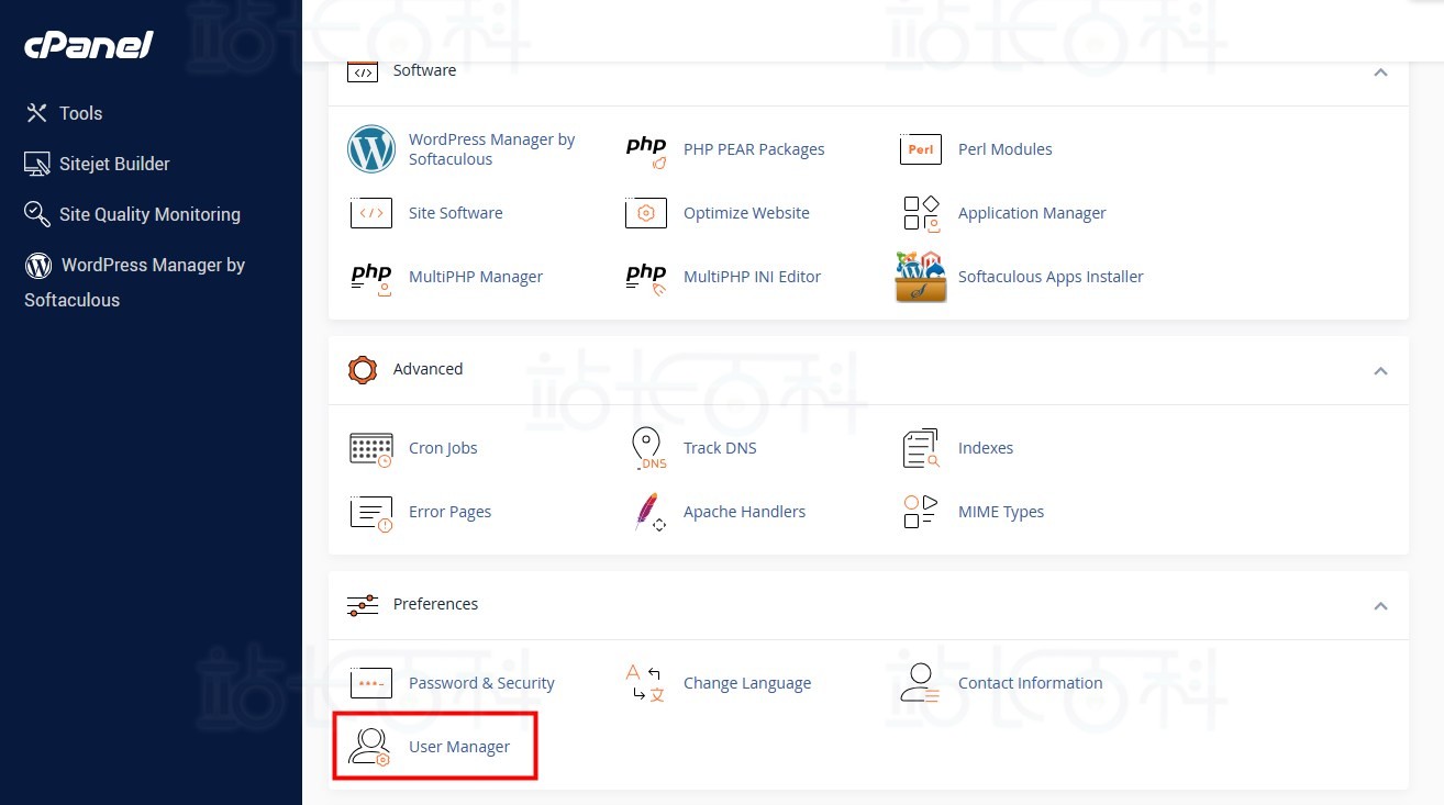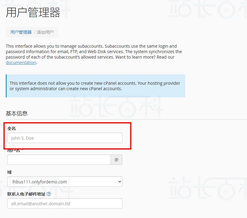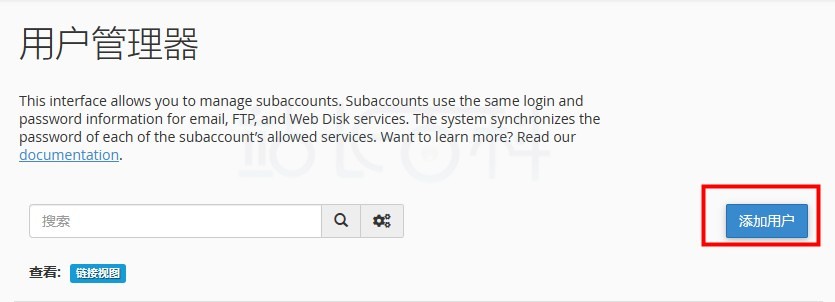 - 用户管理器界面不允许创建新的 cPanel 账户。主机提供商和系统管理员可以在 WHM 的 “创建新账户 “界面(WHM ” 主页 ” 账户功能 ” 创建新账户)中创建新的 cPanel 账户;