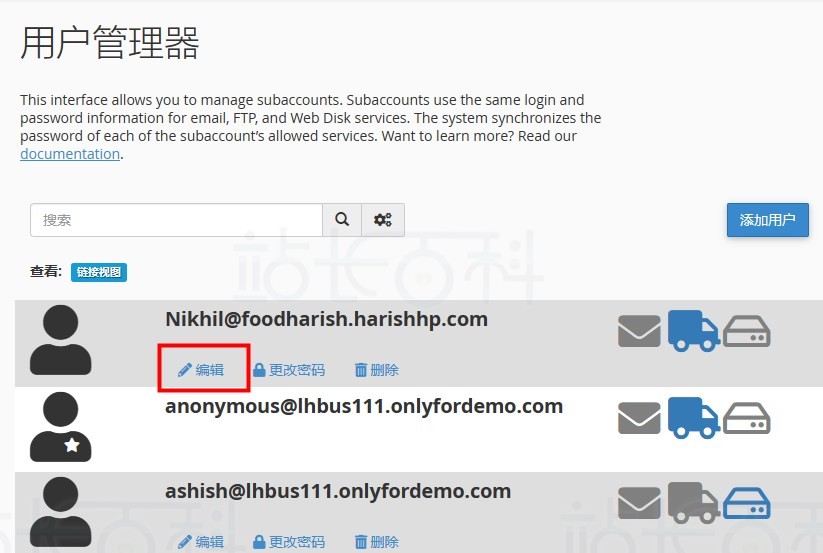 - 在账户列表中,cPanel 账户和账户的图标上都有一颗星号,将不能编辑或删除这些账户;