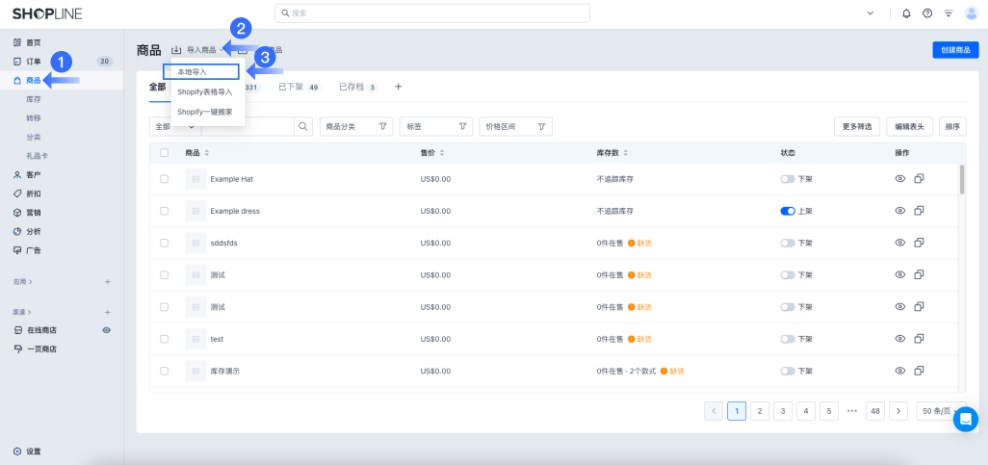 2、进入 SHOPLINE 店铺后台,点击【商品】>【导入商品】>【本地导入】,选择从店匠下载的表格文件,进行导入。